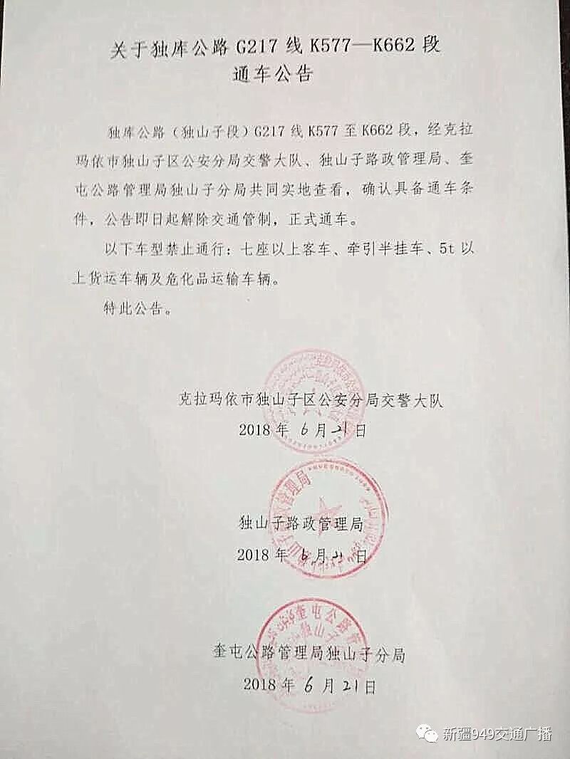 2018年6月21日18時,奎屯公路管理局管轄的G217線K577至K662段(獨山子至喬爾瑪)段,經克拉瑪依市獨山子區公安分局交警大隊、獨山子路政管理局、奎屯公路管理局獨山子分局共同實地查看,確認具備通車條件,解除交通管制,正式通車。以下車輛禁止通行:七座以上客車、牽引半掛車、5t以上貨運車輛及危化品運輸車輛。